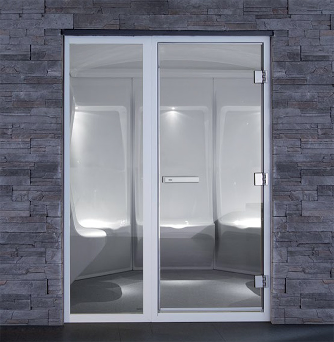 - de sièges individuels intégrés aux parois (des spots d'éclairage à LED, encastrés dans le haut du siège, contribuent au sentiment de clarté, d'espace et de sobriété qui se dégage de ces cabines).